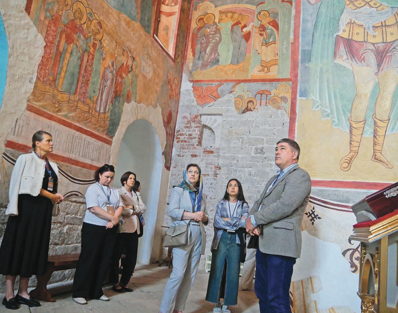 Директор Свияжского музея-заповедника Артём Силкин (крайний справа) знакомит российских и белорусских коллег с уникальными фресками XVI века в Покровском соборе.
